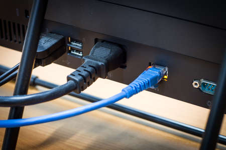 Close up of Blue RJ45 UTP LAN Cable connect to Naked PC Mainboard (Cryptocurrency Mining Rig)