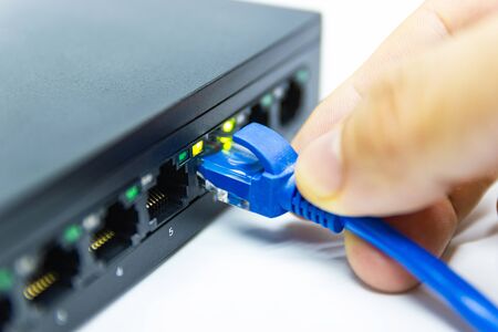 Hand of man holding The blue network cables connect port switch on white table concept internet network connection
