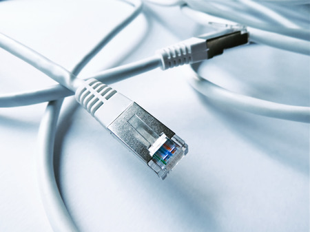 White internet connectors placed on grey surface, cable with plastic clip at tip