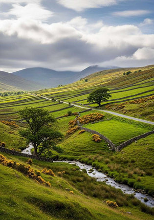 A serene landscape of rolling hills and fields with a meandering stream under a cloudy sky