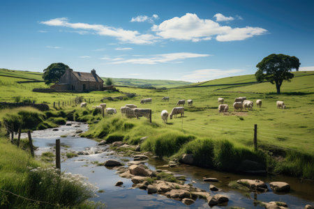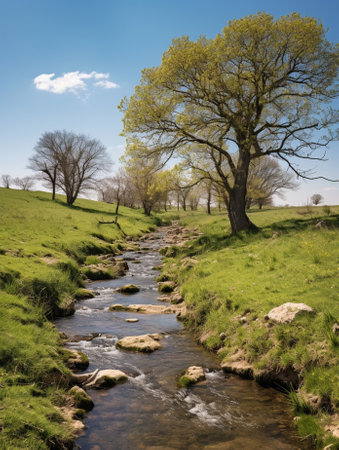 the photo showcases a stunning sky above a picturesque field, reminiscent of delicately rendered landscapes and romantic riverscapes. created using the cinema4d software, this image captures the essence of traditional british landscapes, evoking a sense of tranquility. with a touch of national geographic's aesthetic, the hyper-realistic water adds depth to the scene, while whimsical animals bring a touch of charm. ai generated