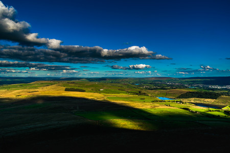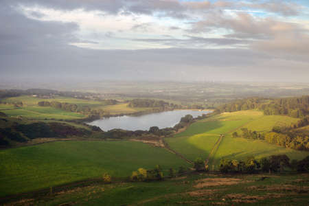 A beautiful view of the Redmires Reservoirs with water lake with green meadows and a cloudy sunny sky