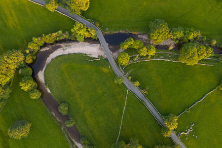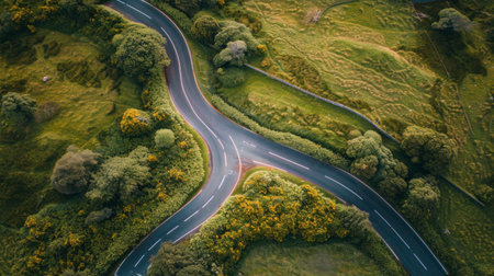 A drones perspective captures a winding road cutting through a vast, verdant field. The road curves and twists through the vibrant green landscape, creating a striking contrast between the man-made structure and the natural surroundings.