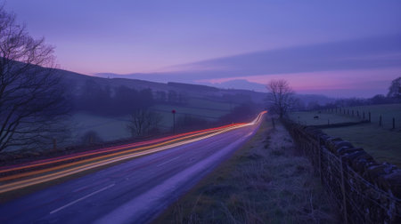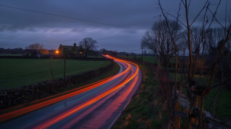 The peacefulness of the countryside is captured in the soft blue and purple light trails of passing cars