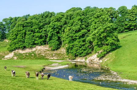 Cattle grazing in green field next to River Bela in Cumbria, England on sunny day with blue skies.