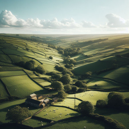 Stunning Aerial View Buckden Villagesurronding fields in the Yorkshire Dales Bathed in Evening Sunlight