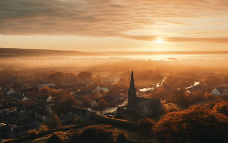 Sunrising on small European town on hillside, covered in mist. Golden hour concept