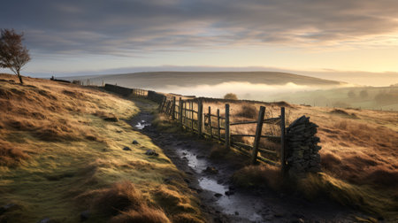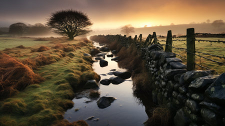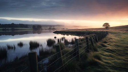 a fence stands alongside a river, creating a picturesque scene reminiscent of traditional british landscapes. the image showcases layered and atmospheric elements, with a touch of mist adding to the pastoral setting. the contrasty lighting, captured at iso 200, enhances the overall ambiance. the colors of light magenta and light amber add a subtle warmth to the composition. ai generated