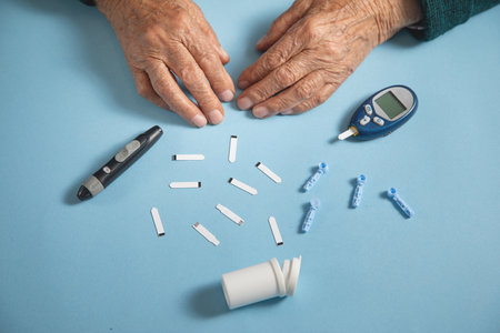 woman hand using a lancet on her finger to check blood sugar using a glucose meter ,, diabetes, glycemia, healthcare concept. blue background copy space top view