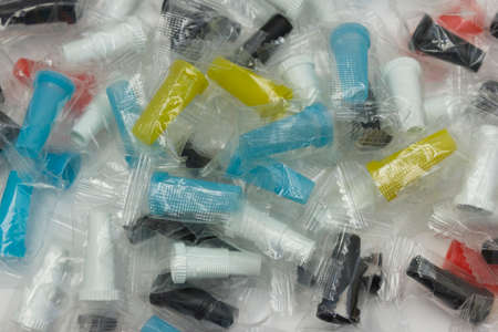 Multicolored disposable mouthpieces for hookah on white background. close-up. accessories for hookah.