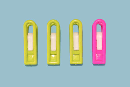 Clothes pins on light blue background, minimal concept idea, flat lay