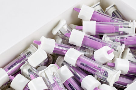 Closeup of slanted rows of syringe self application pens on rustic gray kitchen counter background.
