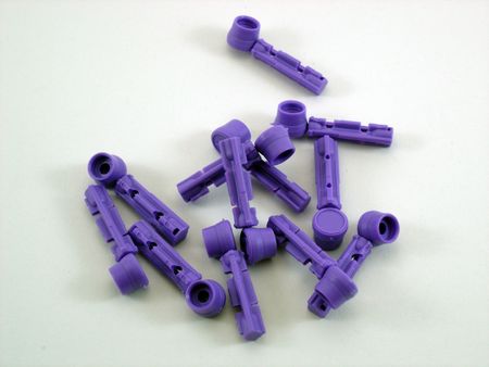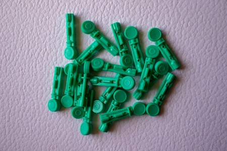 Disposable safety lancets isolated on wooden background, used to collect a blood sample from the finger to measure random blood sugar or to make rapid screen serology tests
