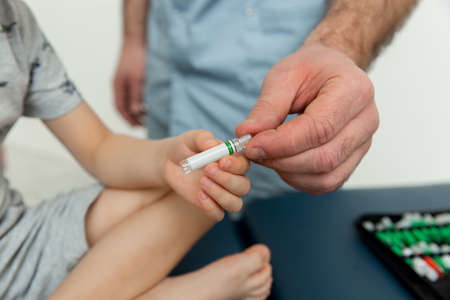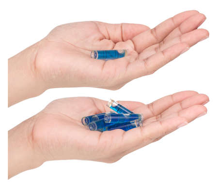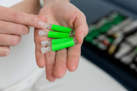Doctor holds in hands small ampoules. Close up of small ampoule with a vaccine in the doctor hand. Holding test tube for allergy test. Allergy Testing for Possible Allergens. Macro shot