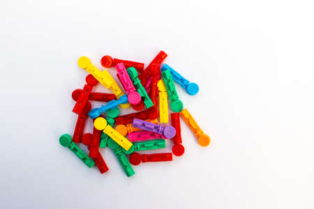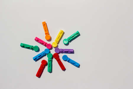 Abstract art design of colorful glucose testing lancets arranged on white background with copy space
