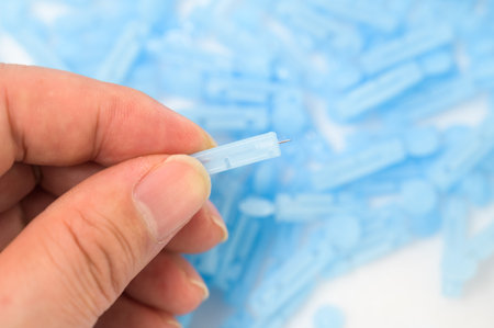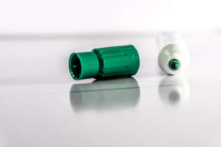 Lancet for collecting blood. Take a blood test. Medical template, copy of space, ad space