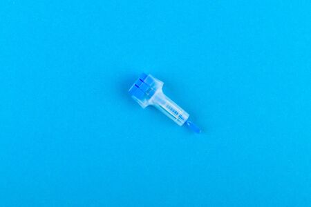 lots of insulin needles on a blue background, spare lancet needles and syringe insulin injection pens copy space