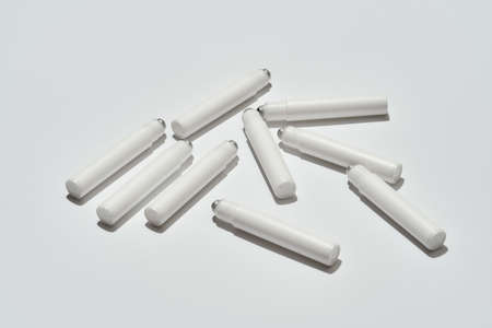 Tubes for eye roller skin care product scattered randomly isolated over white background