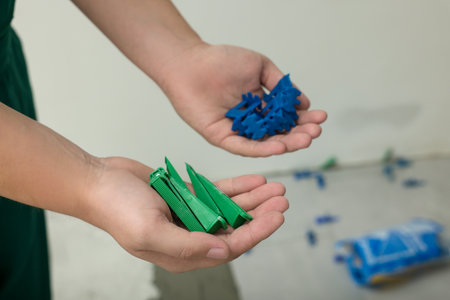 White plastic clinics and crosses for laying ceramic tiles. Accessories and tools necessary for construction workers. Light background.