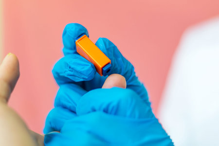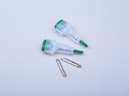 Medical scarifier, in an open box. Automatic lancet scarifier for painless blood sampling . Blood test.