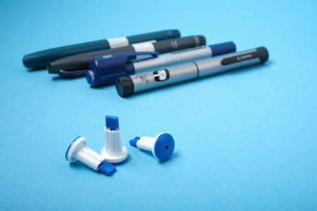 assorted syringe pens for insulin injection and new sterile needles for blood sugar test, blue background