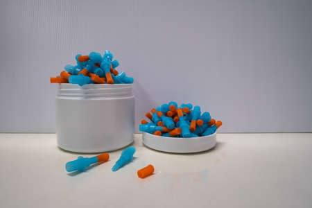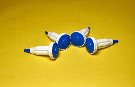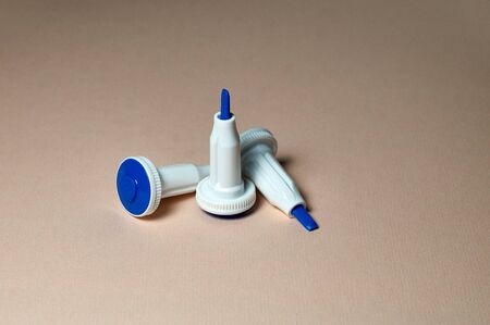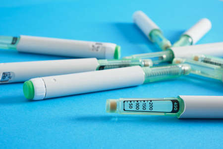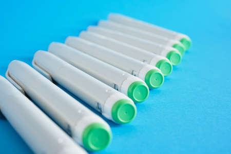 a lot of insulin syringe pens for diabetes treatment on blue background selective focus close up