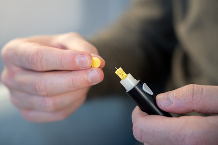 man hands using lancet on finger to check blood sugar or ketones level by glucose meter. medicine diabetes keto diet health care at home