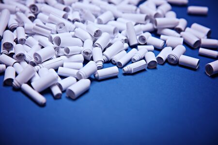 A lot of small white paper scrolls on a classic blue background. Prediction of the future, advice or sign concept. Scrolls of fortune-telling papers.