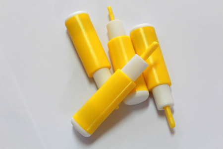 Aligned graphic image of several syringe pen on seamless yellow background.