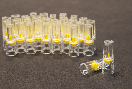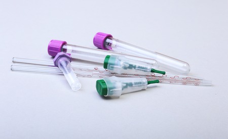 Set of laboratory supplies for blood test. Petri dish, scarifier, Spectrophotometer cuvettes, blood test-tube. Selective focus.