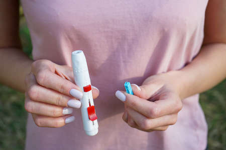Woman patient with pregnancy diabetes holding in her hands an orange glucometer needle with blood strip testing with blood glucose level. Pregnancy diabetes stock image.