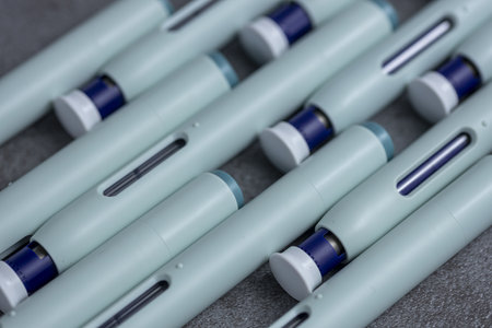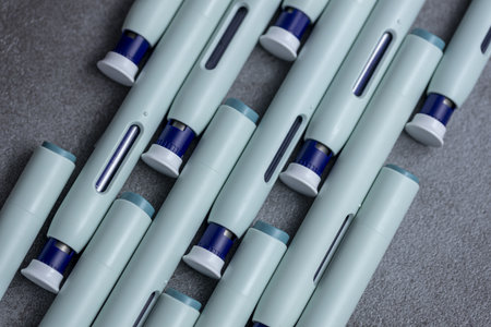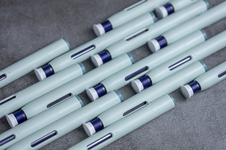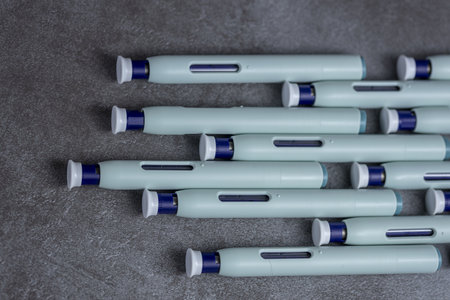 Abstract closeup of organized syringe self application pens on rustic gray kitchen counter background.