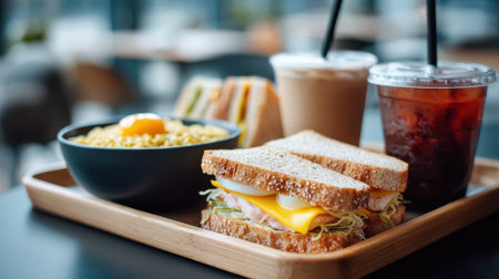 Delicious meal with sandwiches, soup, and beverages on a wooden tray. Sandwiches have layers of ham, cheese, lettuce. Drinks in plastic cups with black straws, one is iced, another is milky