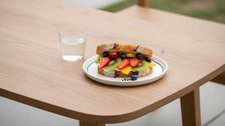 A colorful fruit sandwich filled with thick cream, strawberries, kiwi, and blueberries sits on a white plate. Accompanied by a glass of water on a wooden table, it presents a fresh and appetizing snack or breakfast.