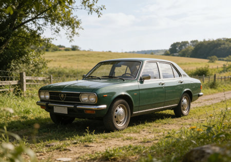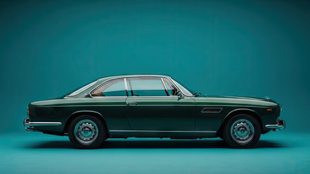 A vintage green coupe car is displayed in a studio setting against a vibrant turquoise background. The image showcases the car's sleek lines and classic design. The composition features a clean, well-lit presentation, suitable for commercial projects, promotional materials, or editorial use. The lighting enhances the vehicle's details.