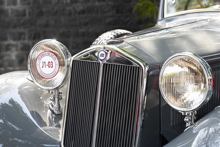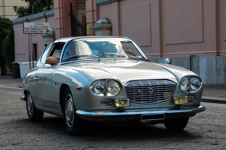 PALERMO, SICILY - FEBRUARY 8, 2020: The frontal part of the legendary Lancia Aurelia B20 GT vintage car in Iraly with an old black number plate