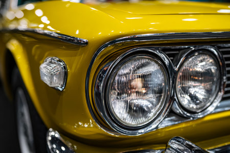 Lecce, Italy - April 23, 2016: Front right side view of vintage classic retro orange automobile car parked in a street of Lecce city, Puglia Apulia region, Southern Italy