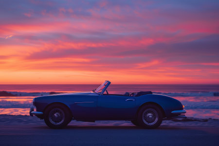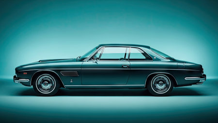 A teal-colored classic car is presented against a seamless backdrop. The vehicle displays a coupe body style with chrome accents. The image showcases studio lighting highlighting the car's curves and design. Suitable for automotive design, classic car restoration, or commercial projects.