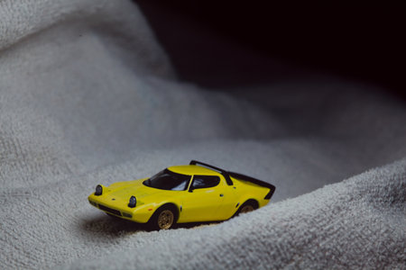 Mantua, Italy - 10TH JANUARY 2025 - Mini GT replica of a yellow Lancia Stratos HF Stradale pretending to run a rally on a snowy road, next to a cliff, in the mountains