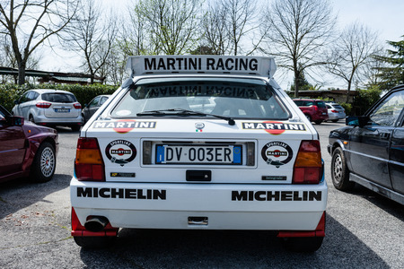 ANGUILLARA SABAZIA, LAZIO, ITALY - APRIL 6, 2014: Back detail of white Lancia Delta HF Integral Martini Racing participating at the 11-th meeting of spring memorial Luciano Polverari.