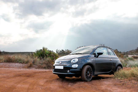 CALBLANQUE REGIONAL PARK, MURCIA, SPAIN - JAN 2020: Fiat 500 rental car in the Parque Regional de Calblanque