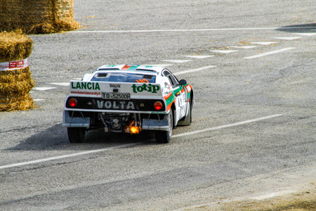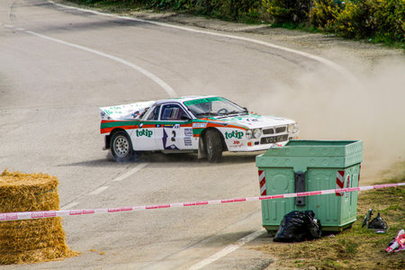 San Marino: 2010 09 01 Rally free eventWhite Lancia Rally 037 Racing on Winding Asphalt Road Totip. High quality photo