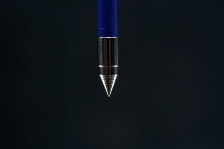 Macro photo of ballpoint pen tip with dark grey background. Extreme macro image of metal ballpoint pen on grey background.