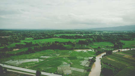 Terrace rice field aerial view in Nan,Thailand. Rainy season. Shot from drone.