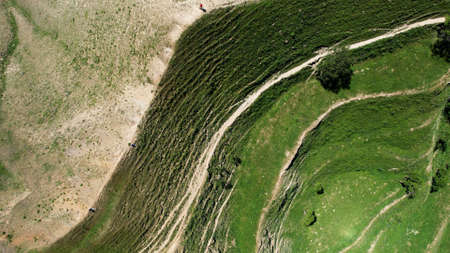 Aerial top view view of a mountain in the national park in Slovenia at spring. Action. Flying above a high hill with a one slope covered by green grass and narrow paths and another by stones and sand.