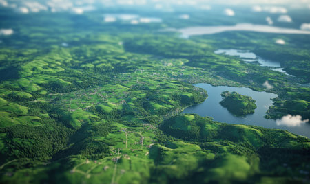 Aerial view of idyllic lake village, green hills, sunny day, nature background