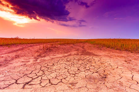 Warm dry cracked land with dead cropps, climate change concept with extreme heat