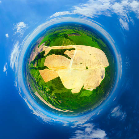 Spherical panorama symbol, aerial photo by drone of farming fields in spring. The plowed land is profitable for business, but there is a danger of exhaustion and erosion