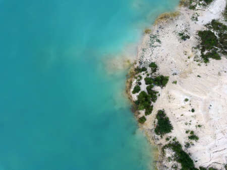 kaolin quarry with turquoise water and white clay.aerial view.