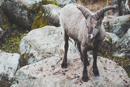 Stands on a rocky surface among the rocks. There are many mountains and rocks.